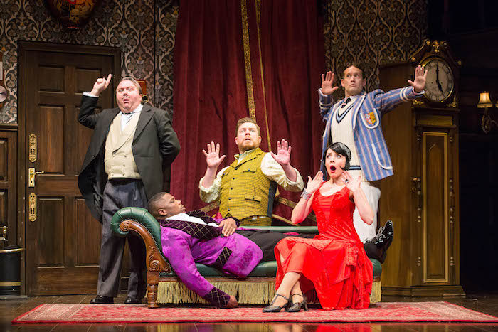 True to the title, everything that possibly could go wrong does go wrong in this play about a play — Cornley University Drama Society’s production of the 1920’s mystery “Murder at Haversham Manor.” Forget plot and character development; this two-act treat is all farce and choreographed chaos. Lines are forgotten or delivered in the wrong order, the scenery crashes all around them (quite spectacularly in the finale), and the actors veer between hyperbolical reactions and the utter failure to talk their way out of the bungling. Reminiscent of Noises Off, this is an unforgettable comedy wrapped around a totally forgettable drama.