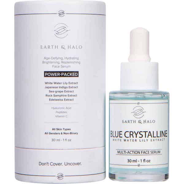 BLUE CRYSTALLINE White Water Lily Extract – Multi-Action Face Serum By Earth & Halo This environmentally friendly serum loaded with hyaluronic acid and plant based peptides is sucked into by your skin upon contact. It promises to control excess oil, purify pores, improve elasticity, reduce the appearance of fine lines, and improve overall texture, tone, and clarity. Unisex and precious. $60 www.earthhaloskincare.com