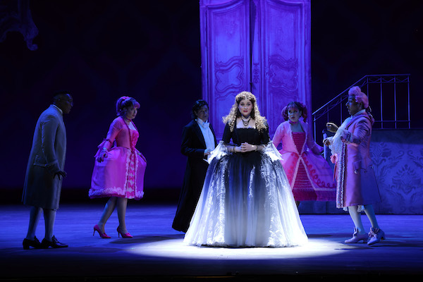LA Opera’s Cinderella is a co-production of Dutch National Opera, Grand Théâtre de Genève and Valencia’s Palau de les Arts Reina Sofia. Director and costume designer, Laurent Pelly and Jean-Jacques Delmotte blend mid-century aesthetic with the baroque, demonstrating that the fairytale, with its dysfunctional family dynamic, youthful romanticism, and important values of kindness and forgiveness are indeed timeless. The bane of today’s revivals have often been the contemporization of sets and costumes, sometimes taken to such an extreme as to drain the opera of the opulence one has come to and should expect from them. A cost-saving device, or an attempt at inject a new, artistic vision? Who knows, except that in these desolate times what we need more than ever is color and extravagance, not starkness. Thankfully, in this version, Pelly and Delmotte cleverly fuse periods so that Rossini-era courtiers in large powdered wigs and tailored coats look not a bit incongruous beside pony-tailed girls in puffy 50’s prom attire.