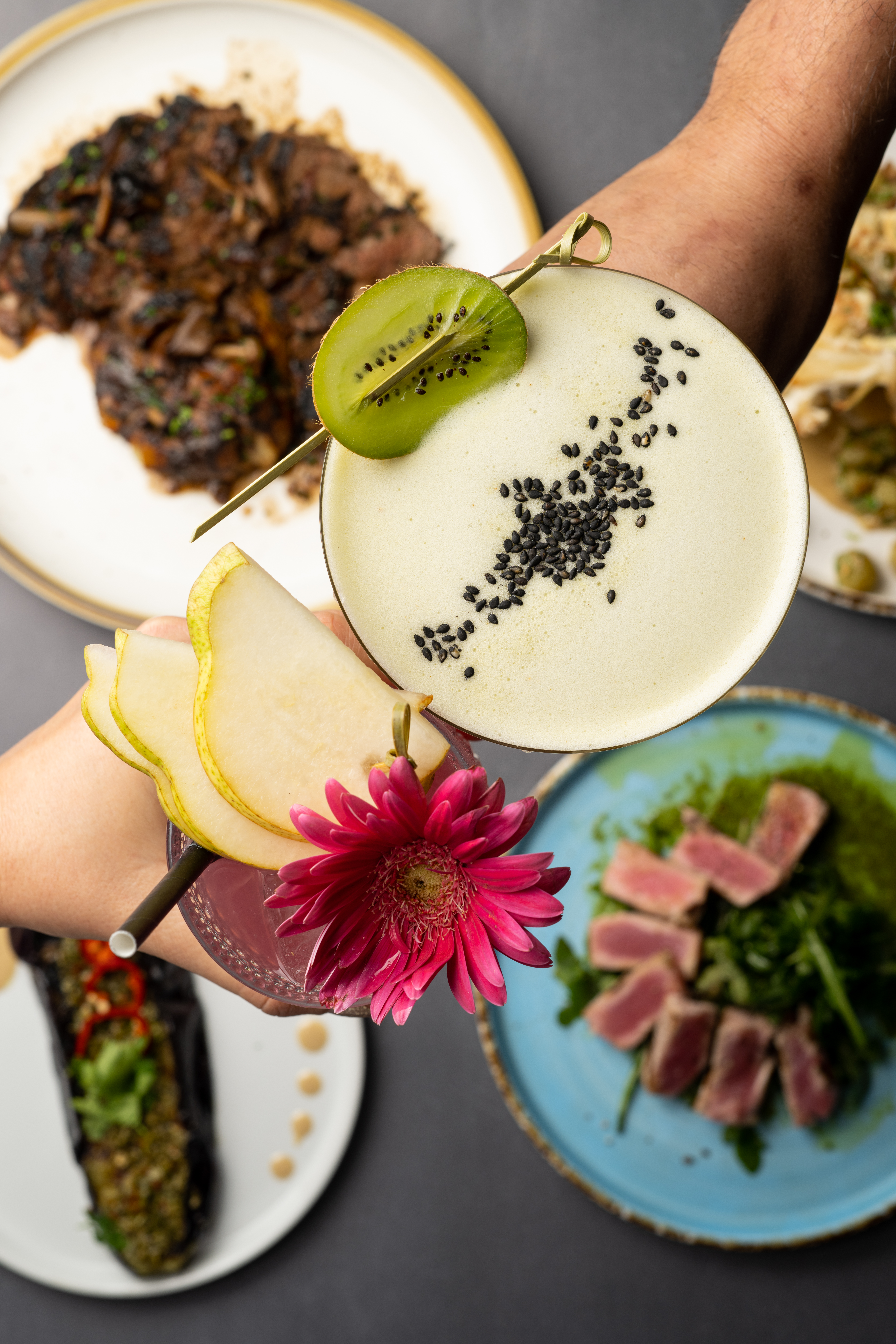 Proprietor, Max Simon, who once owned a club in Paris, apparently drew inspiration for his restaurant from the European island party scene, especially Mykonos (though we felt a more Brazilian vibe). He views dining “as performance,” promising: “Guests will be entertained through smoking dishes, color-changing beverages, DJ curated music sets, and more.” He doesn’t disappoint. Every ten minutes or so, a team of servers stride past with sparkling wands and festive cheers as guests throw down shots and participate in the merrymaking. The music is pulsating and eclectic, signaling from the moment you arrive that your goal is not merely to eat, but to celebrate and linger. Simon’s passion is contagious as he spins through the room like a dervish, ensuring his guests are comfortable and ready to have a memorable time.