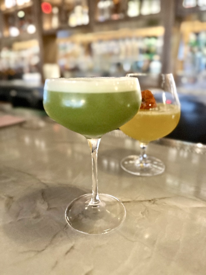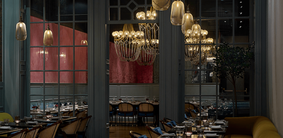 Entering the restaurant, guests are immediately enveloped in an ambiance of saturated color, opulence, and refinement. Turquoise tufted banquette seats, sprawling booths, and resplendent chandeliers set the stage for an unforgettable dining affair. Adding an extra layer of visual intrigue to the already captivating ambiance is the stunning mural by acclaimed artist Jess Kollar, infusing the space with whimsy and sophistication.