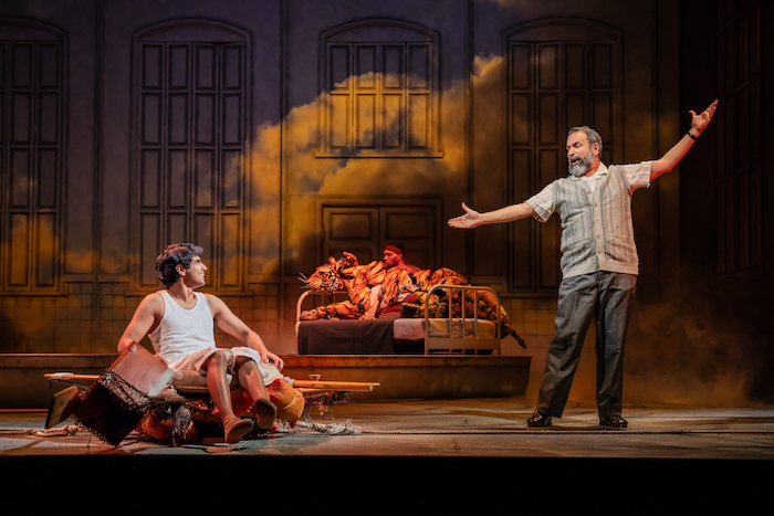 What sets this adaptation apart is its inventive use of puppetry—not as novelty but as necessity. The tiger Richard Parker, whose presence on the lifeboat is both threat and salvation, is conjured through intricate manipulation and exquisite choreography, forcing us to see not just a beast, but the embodied tension between fear and companionship. Alongside him, a zebra, a hyena, and an orangutan—each rendered with striking poignancy—animate the lifeboat’s crowded metaphor for survival.
