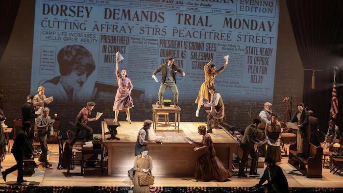 And what voices these are. In a bold and deeply effective departure from traditional musical theater norms, most of the male actors forsake florid vibrato for clarity, strength, and emotional urgency. Max Chernin brings nuance and restraint to Leo Frank—his internal storm conveyed not through grandiosity but through tightly held dignity and despair. Yet it’s Ramone Nelson as Jim Conley who nearly brings the house down. His performance of “Blues: Feel the Rain Fall,” a gospel-inflected chain gang number, channels the aching soul of Donny Hathaway.