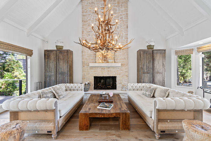 The interiors marry elegance with ease. A pair of custom faux antler chandeliers lends rustic sophistication to the living area, while the adjacent kitchen offers every modern indulgence: ZLINE appliances, a natural stone backsplash, concealed fridge, and custom cabinetry accented in matte gold. The palette is soft and organic, with plush, neutral furnishings, bronze-nailed armless chairs, and a cozy reading nook that encourages hours of repose.