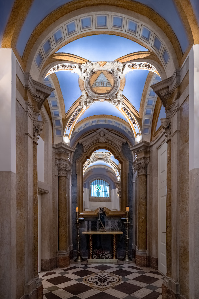But the crown jewel may be the small private chapel—its ceiling adorned with the Hebrew name of God, encircled by four angels with their wings closed in protection (a symbolic rarity for the era). Below them, the Ludovice family crest is carved into the marble floor. It feels less like a relic and more like a quiet conversation with the divine.
