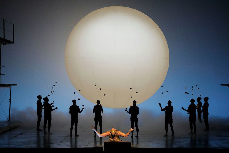 From there the narrative follows Akhnaten’s birth, coronation, and revolutionary religious vision—the establishment of a monotheistic worship centered on the sun. A radiant disc of light looms behind him, reinforcing his belief that he is the son of the sun god. As the drama unfolds, Glass’s score mirrors the shifting emotional landscape. Tempos expand and contract, and an inventive signature of this production—a troupe of jugglers—translates the music into movement. Manipulating balls with astonishing precision, their patterns accelerate and slow in hypnotic dialogue with the orchestra, becoming a visual embodiment of the score’s rhythmic pulse.
