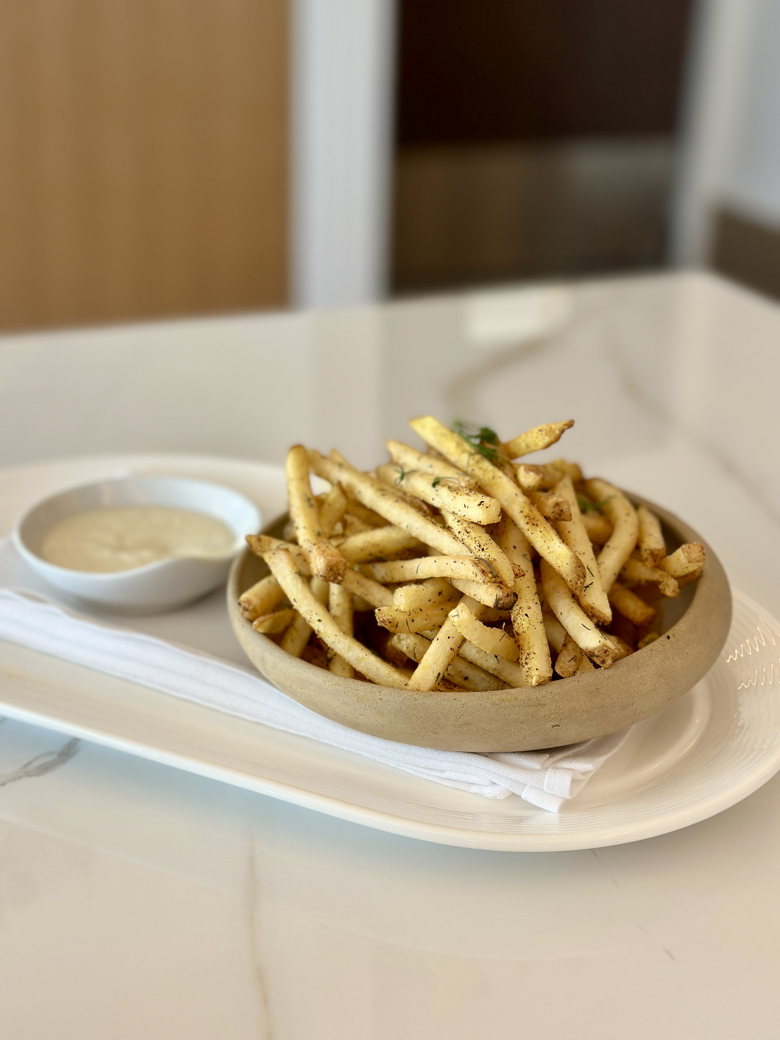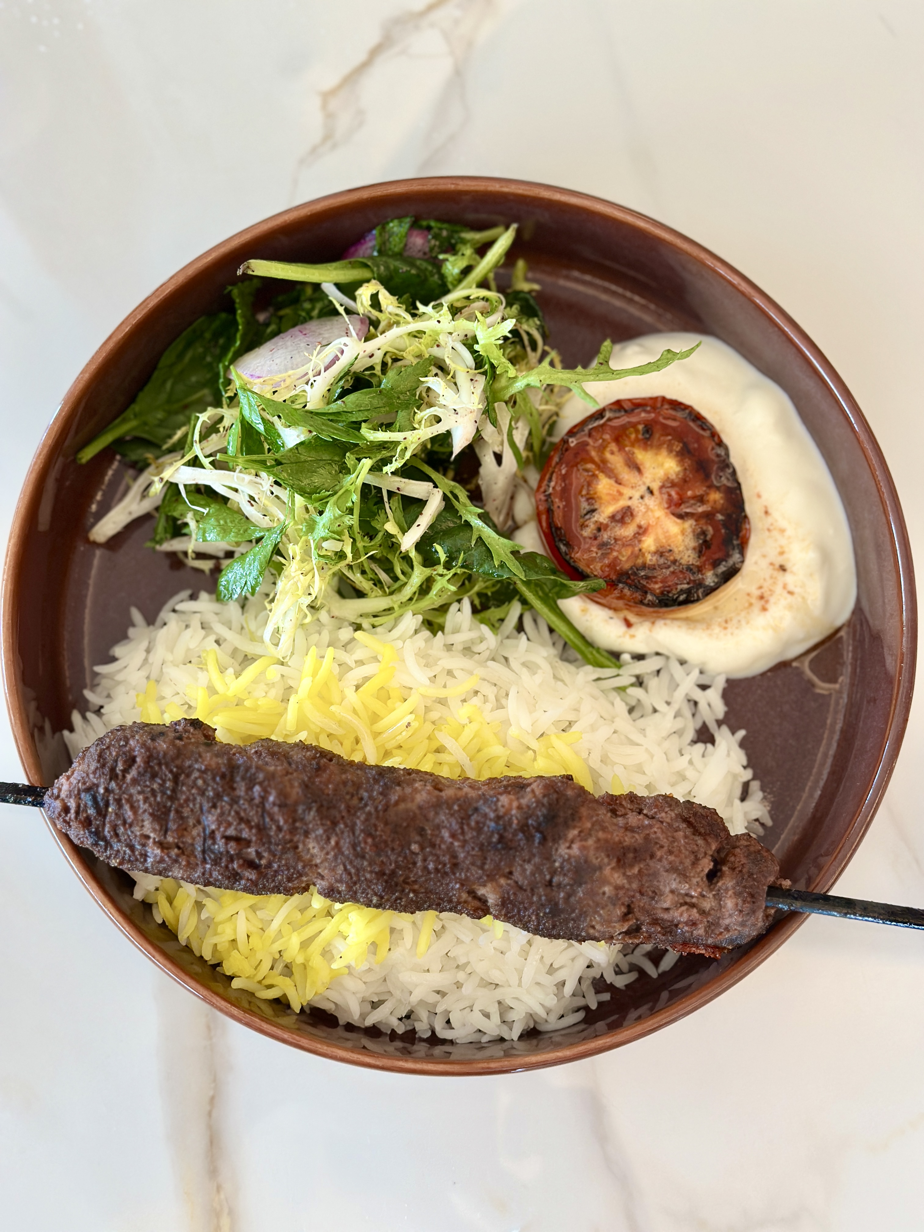 The prix fixe begins with a trio of well-composed starters. A crisp Caesar salad arrives anchored by a whole wedge of lettuce, its saffron-kissed dressing lending a subtle warmth to a familiar classic. The Persian fries, dusted with sumac and dill, are a standout—crisp, aromatic, and paired with a feta aioli that adds a creamy, tangy counterpoint. Each bite feels thoughtfully calibrated, balancing brightness with depth. For the main, the beef koobideh offers a satisfying richness, its texture notably thicker and more substantial than many versions. Served alongside a seared tomato, it delivers both comfort and character, a dish that leans into tradition while maintaining a polished presentation.