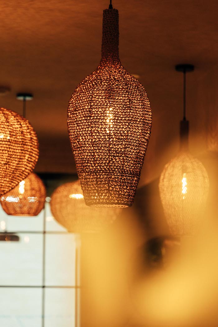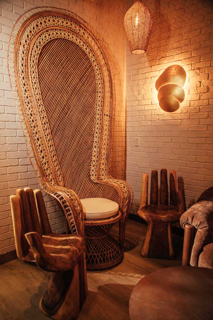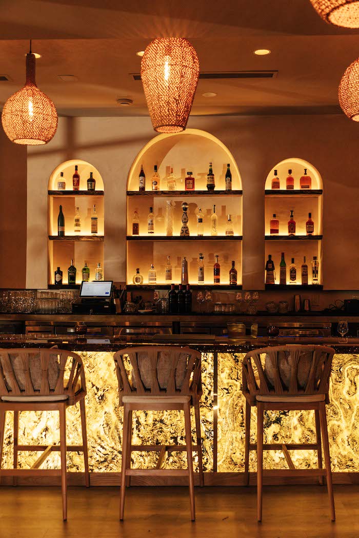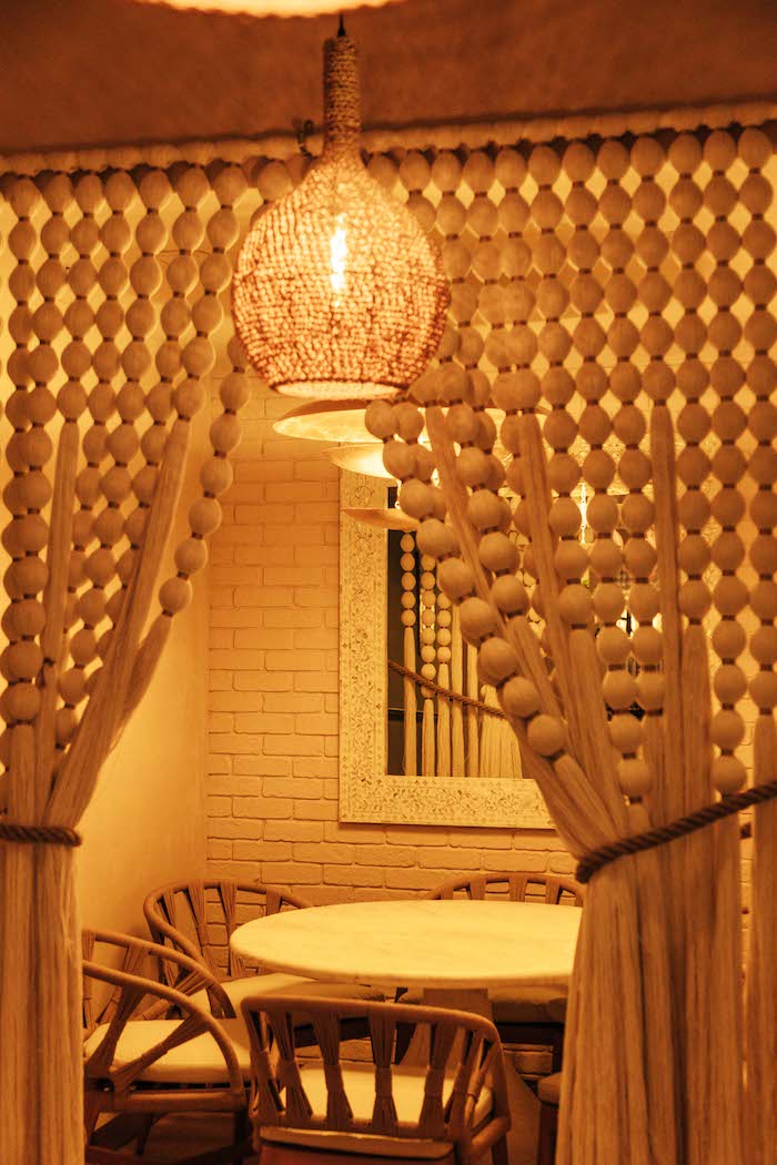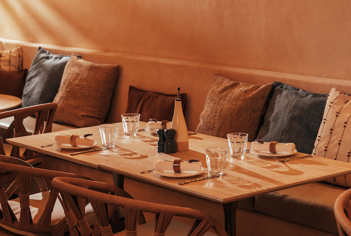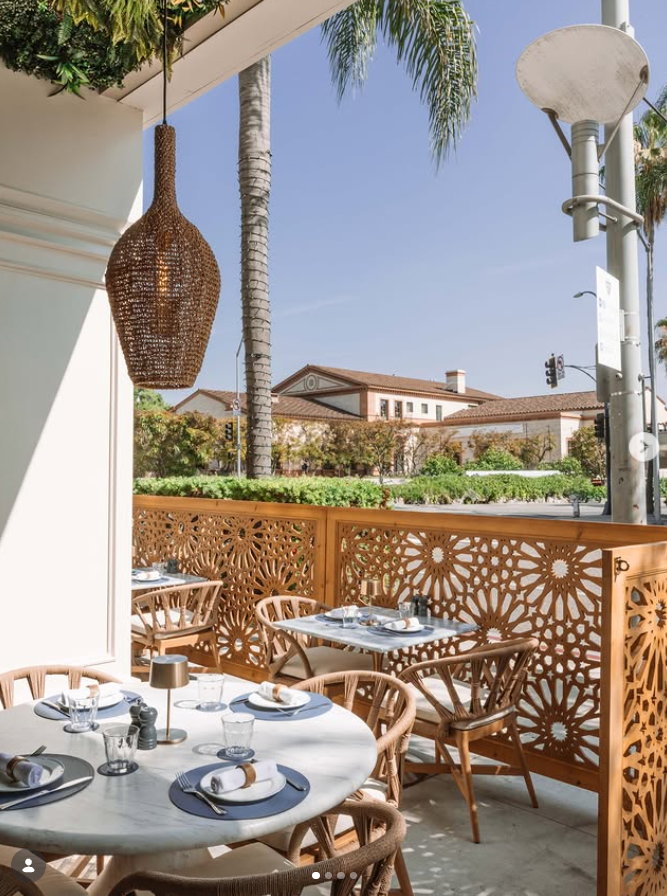 The room itself strikes a careful balance between polish and ease. A palette of creams and sandy beiges, accented by rattan chandeliers, creates a setting that feels coastal and refined—Ibiza by way of Beverly Hills. Even the details are considered: plates edged with the words “The French Art de Vivre” serve as a subtle reminder of the philosophy guiding the experience.