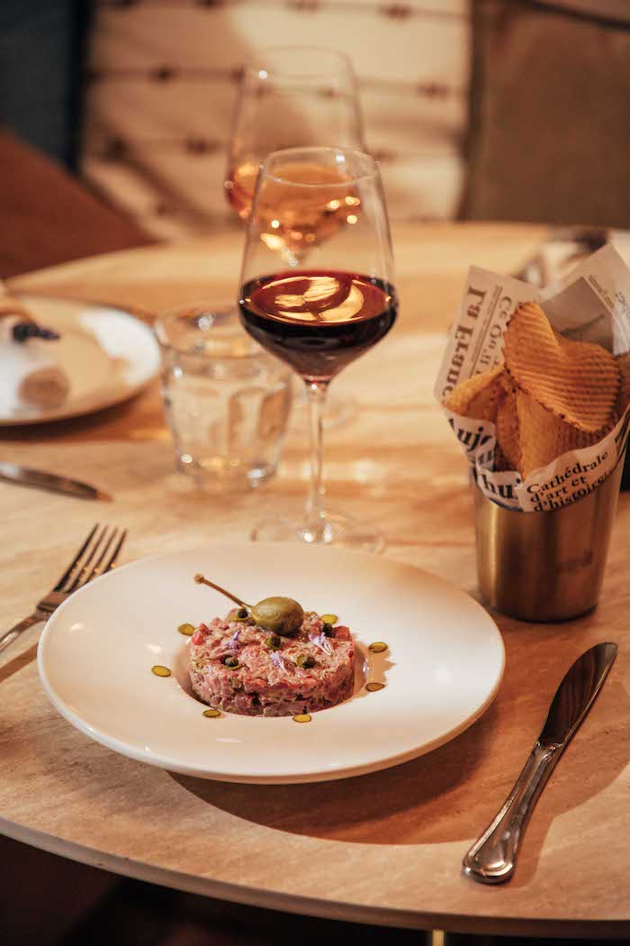 Among the starters, the pissaladière is a quiet triumph—a flaky, Marseille-style tart layered with slow-melted onions, anchovies, and Niçoise olives, its thinner profile allowing each element to come through with clarity. The tartare de bœuf, made from hand-cut prime beef and delicately seasoned with capers, shallots, and olive oil, finds its edge in a well-judged mustard that adds just enough piquancy to elevate the dish. Paired with crisp waffle-cut potato chips, it offers a satisfying interplay of texture and flavor.